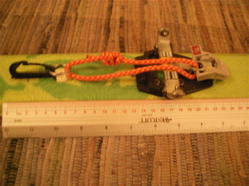 I saw a leash in Backpackers Supply in Tacoma today advertised as a tele-leash and made by Croakies the same people who make the sunglass thingies. They had a split ring at one end and a clip at the other and mid-way between was a buckle like the one on the sternum strap of my pack.