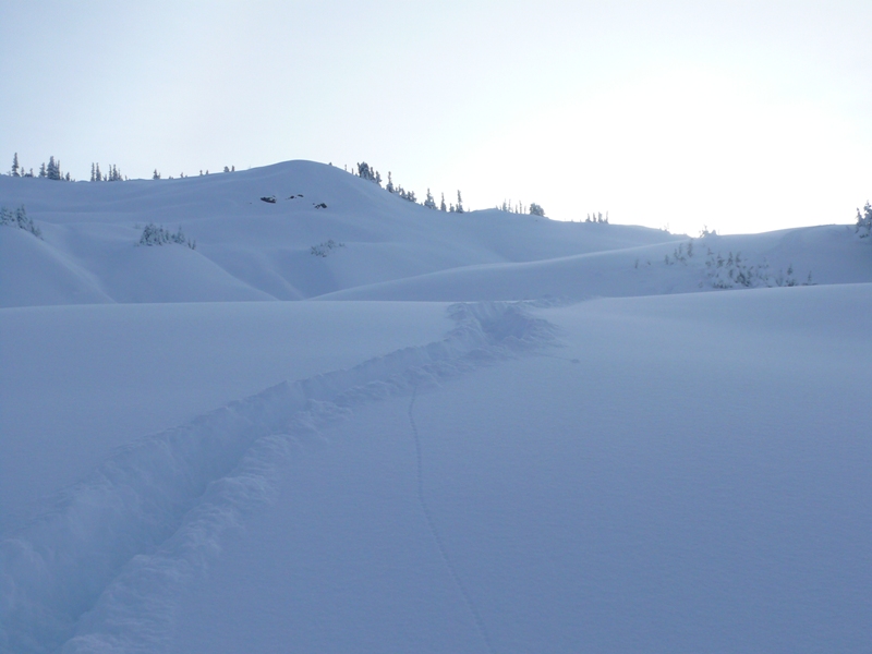 Yesterday near Baker......Marmot drainage area. It was a bitter cold day and I noticed an unusual skin track, although the track appeared to be a desperate descent.....it also worked out well for a skin track. Thankyou Goat or whatever you might have been. It's always nice when you can poach an animal track....... there's more value in poaching the animal track than the animal itself.