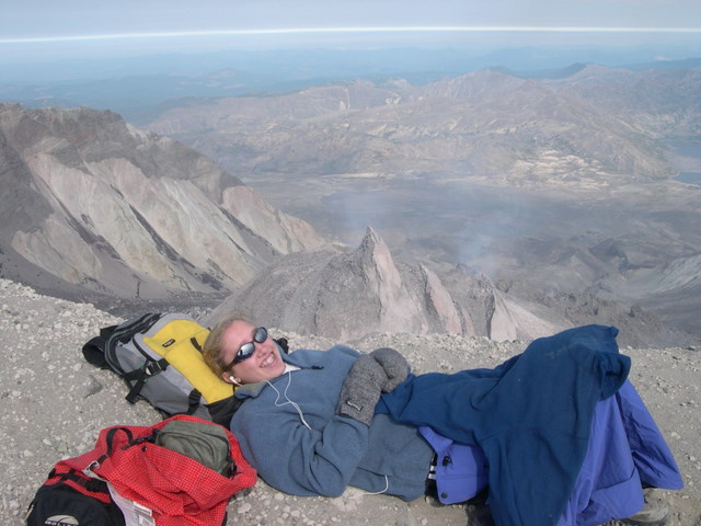 2006 - Scrambled up to the top of St. Helens. Pre-dawn start, napping at the top by 10:30. See picture below.