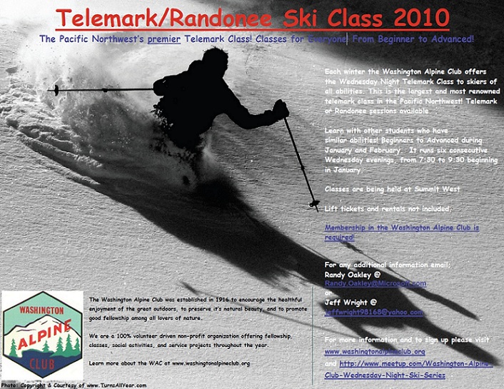 Description: Come join the oldest and largest telemark ski instruction program in the US. Develop your skills so you can enjoy the backcountry even more. The WAC Wednesday night Telemark / Randonee program has classes for skiers of all abilities -- So if you've never skied before or if you've skied for years, this program will help you have more fun on the snow. There are six sessions: Start on Wednesday January 6th 2010 through February 2010. Classes start at 7:30PM and end at 9:30PM. Classes are being held at the Summit West area on Snoqualmie Pass. Instruction is provided by professional ski instructors. Last season we had nine sections of telemark skiers and four of randonee skiiers -- so you'll be grouped with skiiers of similar ability.