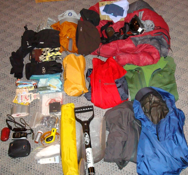 Sweater, vest, down jacket, hats, goggles, 3 pair gloves, wind jacket, gore pack lite Jacket and pants, skins, crampons, snacks, 1st aid, repair kit, maps and compass, probe, shovel beacon, camera, headlamp, about 75oz water in hydration system. can even hold a helmet.