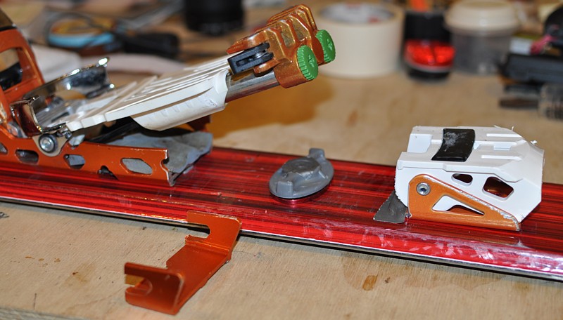 When I toured with Kneel and Eric 11 days ago I had damage to the silver-grey piece that slides forward and back under the orange tour pivot lever. I don't know what you call this part but it's the the third from the left in the top row of Kenji's photo from 2/23. The little wing features seemed to be bent outwards, or the flat part was bent in a way that made the wings stick out and jam, preventing the piece from sliding and jamming the tour lever so it did not lock into turn mode. There was some snow accumulating under the tour lever, which may have stressed the silver-grey piece. I had increasing trouble getting the turn lever to lock into place through the day; could barely get the boot out of the binding back at the car.
