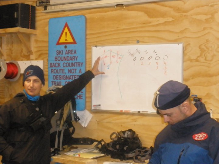 The part that I thought was the most valuable was that they gave us lots of opportunities to try it all out from start to finish. We had to ski down the slope, get our gear together, and save our buried backpack “victim”. After we did this a few times we skied down the mountain and the instructors would take turns skiing ahead and burying backpacks, but this time we had to organize, search and dig as a party of five. One of the searches even involved side-slipping a very steep, narrow, and icy chute until it fanned out at the base and conducting our team search there. It was by far the most realistic search practice I have ever done. It was also nice to have professionals watching our technique. I learned that I have been conducting my fine search slightly incorrectly for years. It felt really good to hit the backpack on the first probe.