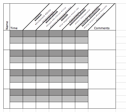 Below is the format I have come up with for recording the observations. When first implementing this tool, I think it is advisable to go through the process of actually recording your obs. Obs. should be taken at the trailhead and then throughout the day, especially at decision points. Recording will give you a visual to track trends for a person throughout the day and a way to compare individuals of the group. After going through the process several times, it will become fluid and observations can be made continually throughout the day. Ultimately, these descriptors give us a common vocabulary to talk about targeted Human Factor Observations.
