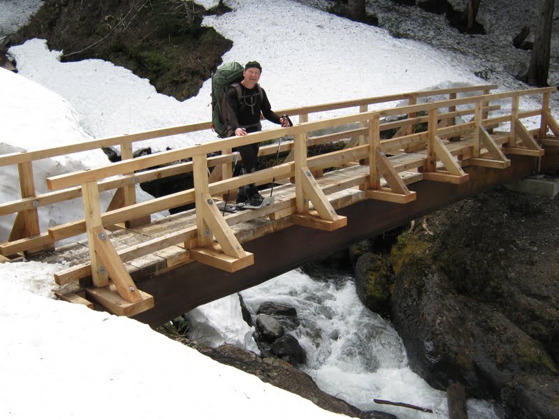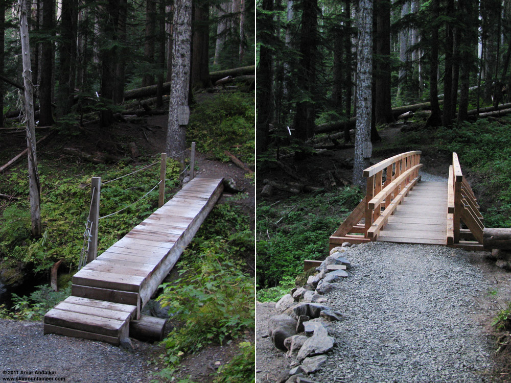 Here's the old bridge on the Heliotrope Ridge trail in October 2009, and the new bridge just after completion in July 2010: