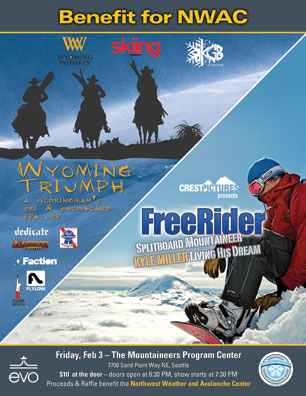 It's at The Mountaineers Program Center, 7700 Sand Point Way NE in Seattle. Admission is $10 ($11 online with a credit card). The doors open at 6:30 PM so plan to come early, drink beer, buy raffle tickets, and hook up with friends. The show starts around 7:30 PM with a brief introduction of FreeRider by filmmaker Robert Chrestensen and Kyle. Then KGB screens their feature-length film Wyoming Triumph. A raffle for gear from EVO and Eddie Bauer's First Ascent will follow the screenings. Proceeds are for the benefit of the Northwest Weather and Avalanche Center (NWAC).