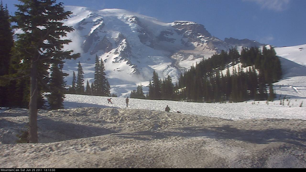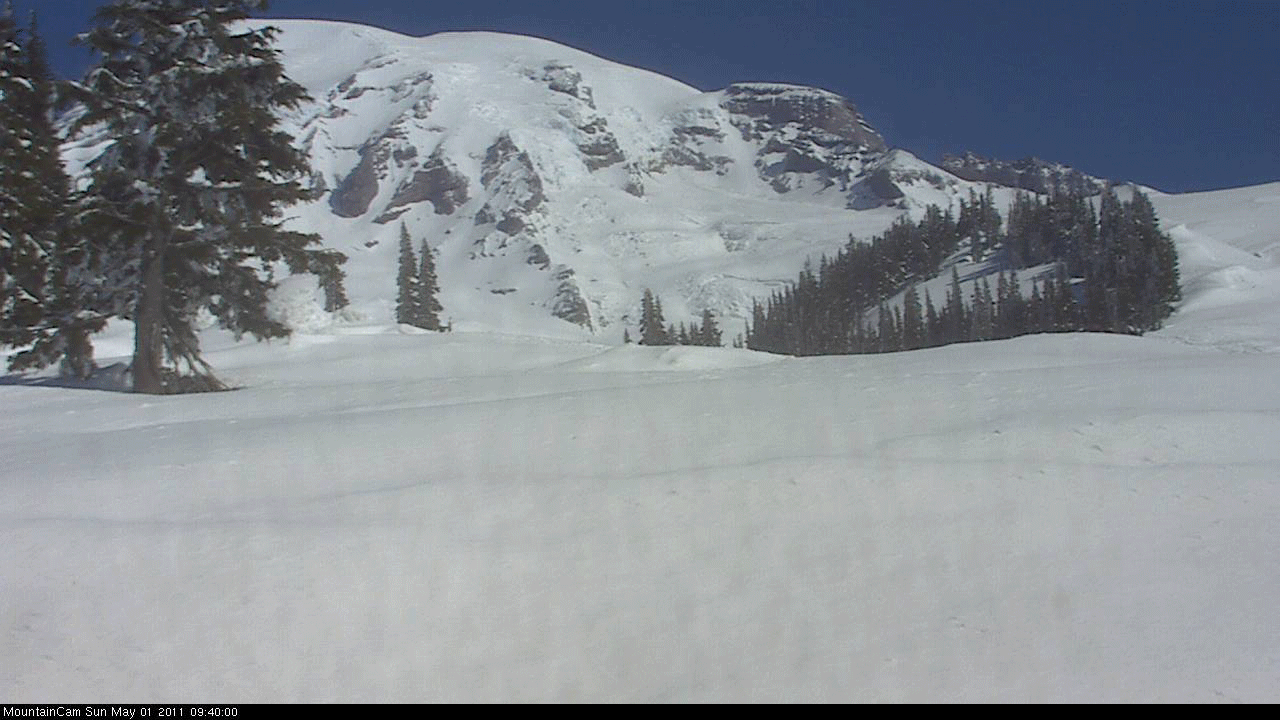 Looking through my script-saved webcam images, I came up with this interesting time-lapse animation of images over the last 2 months from May 1 to July 1, showing the obvious motion of the Nisqually Glacier and Icefall, ending with the recent avalanches. The snowdepth at Paradise has decreased from 247" on May 1 (just after the seasonal maximum of 253" on April 28) down to 144" as of July 1.