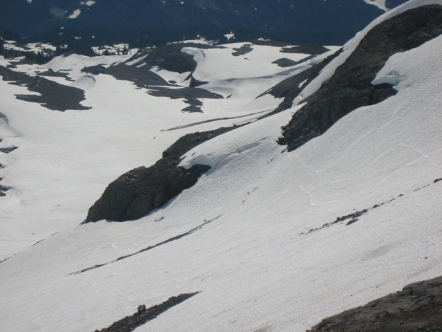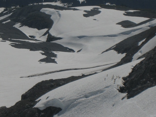 Bear did good getting out of hole, but we watched these goats for awhile yesterday on the Paradise Gl, and they had their hooves locked down, so they never slid into a hole....What's more, I've seen cubs sliding down snowbanks having as much fun as your average telemarker (which is to say twice as much as most AT skiers). ...