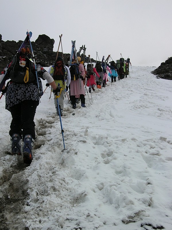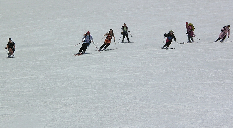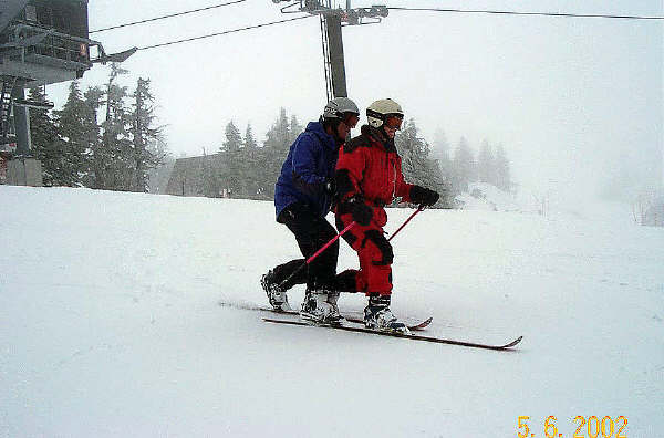 I've always liked this pic of our gang skiing St. Helens in Mother's Day finest...  though my short black cocktail dress with no pants (over on the left) turned out to be unwise a few turns later.  Dinner plate sized snowburn...