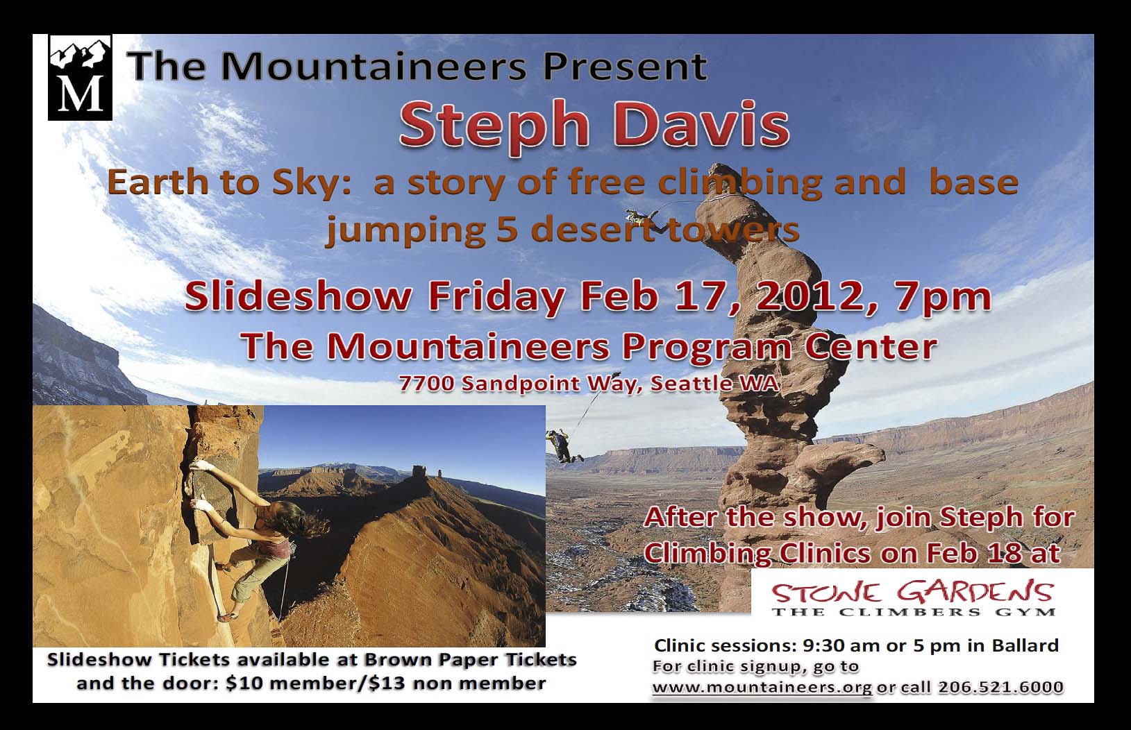 [size=14pt]World-class climber Steph Davis is presenting her slideshow “Earth to Sky.”[/size]