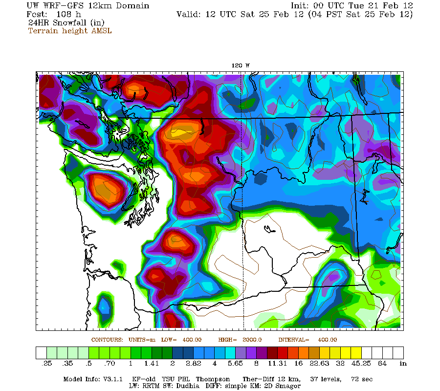 However, this is not going to be a Pineapple Express at all, the flow is really quite westerly, not southwesterly or southerly (as the predicted location of the Olympic rain shadow above shows). So this should produce HUGE snowfall above 6000 ft in the north-central Cascades and on Rainier, perhaps 3-5 ft of snow by 4am Wednesday: