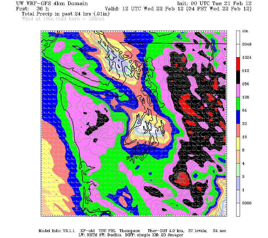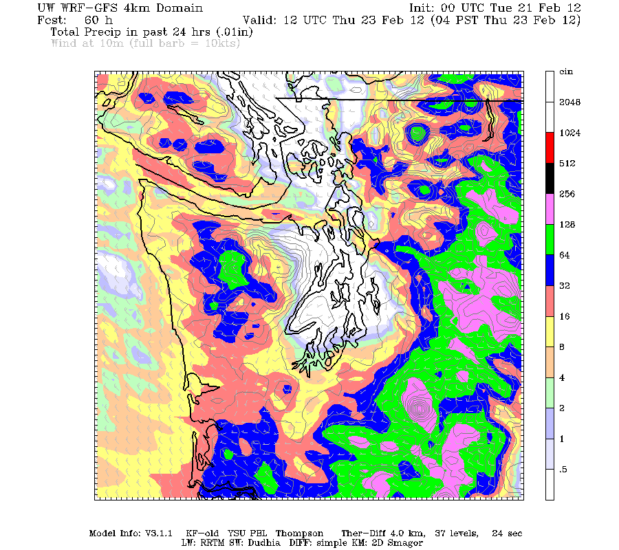 Obviously this system is bringing a lot of precipitation, up to perhaps 5-10" in many parts of the WA Cascades over a 48 hour period, but the UW weather model is predicting a strong rain shadow for the central Puget Sound (along an axis roughly from Bainbridge Island to Seattle). After some initial rainfall early tonight, this area is predicted to be almost completely dry over the next 48 hours, the driest spot in western Washington: