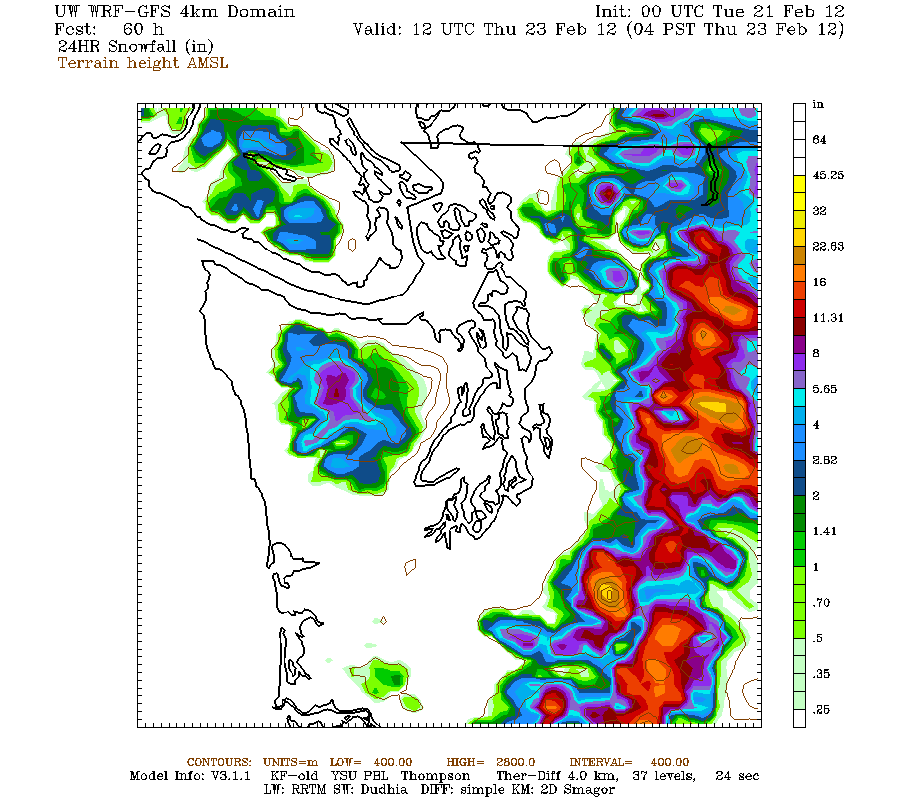 Snow levels should drop throughout Wednesday down to about 2000 ft overnight, producing a widespread 1-2 ft of snowfall over much of the WA Cascades by 4am Thursday: