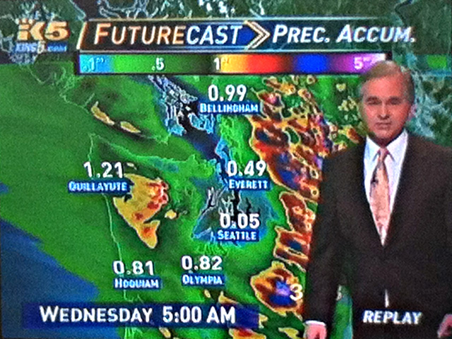 Interesting to see that KING-5 TV weather has been using and showing output from the UW model frequently over recent months. Here's a screen shot of Jim Guy explaining the rain shadow over Seattle during this storm, with precip amounts and graphics derived from the UW model: