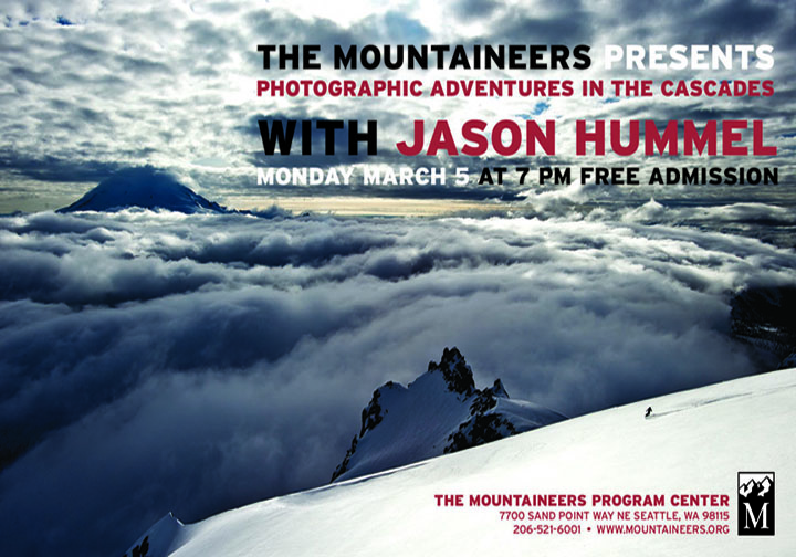 A nationally published photographer, Jason started climbing in the Cascade Mountains as soon as he could walk. After leaving his job in finance in 2009, he decided to seek out his passion. Since then, he has published images in magazines like Backcountry, Skiing, Coast Mountain Culture, and more. He has shot photographs for ski resorts and companies alike. Take this opportunity to join Jason at the Mountaineers on Monday, March 5th at 7pm in Seattle.
