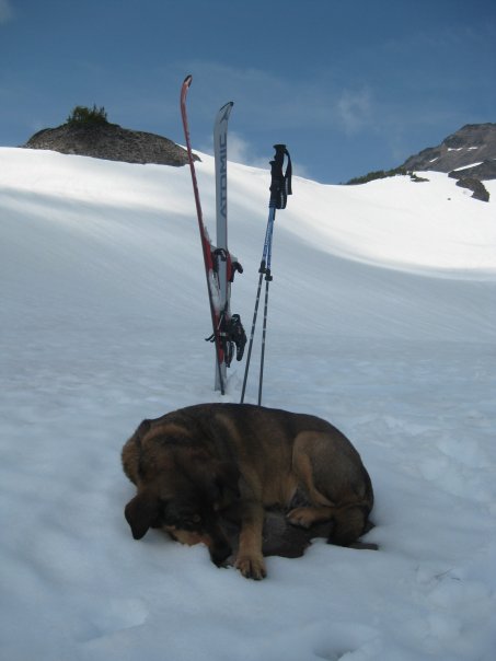 Now, I don't see why your dog would have any trouble skiing especially in spring snow. A good place to test your pup is Hyak or Silver fir (once Summit Central closes).