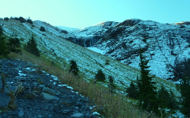 Heliotrope moat site without snow from climbers trail along hogsback