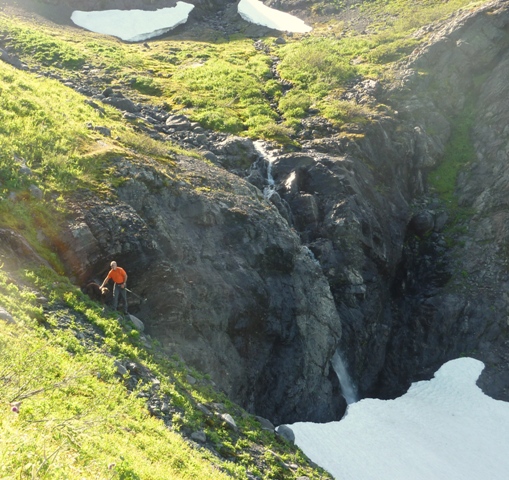 Last year, at least two people fell in the moat on separate accidents. One did not survive. This moat has claimed more than one life. I don’t know the exact count. The Baker climbing rangers blogged about the hazard here: mtbakerclimbing.blogspot.com/2011/07/hogsback-moat.html . I have added a couple of pictures below showing the site without snow.