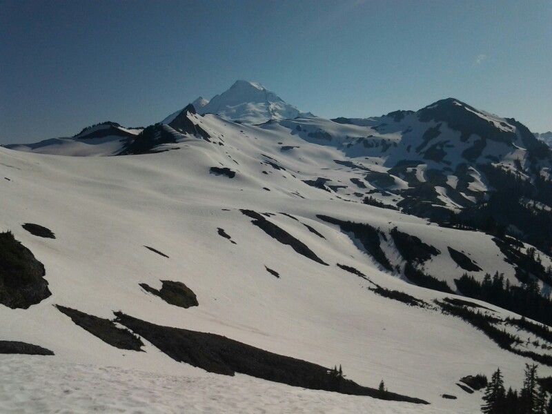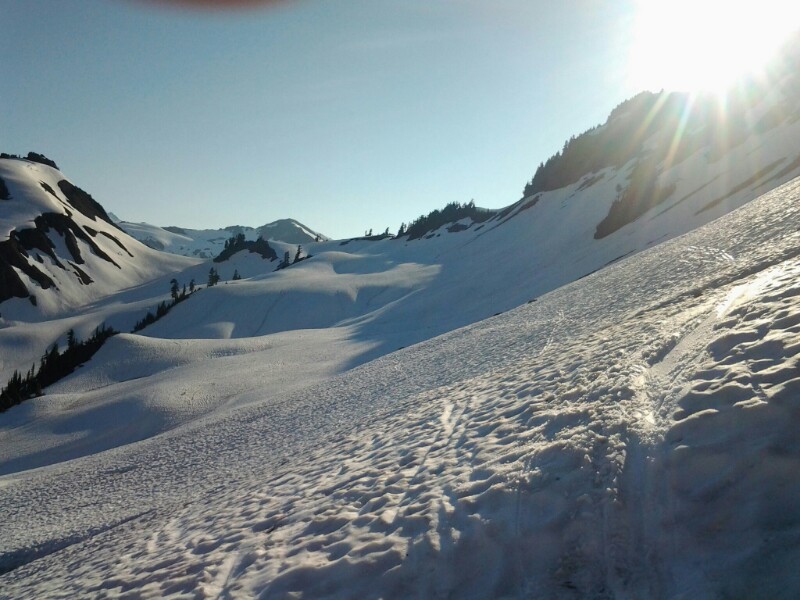 In case anyone is wondering, there is plenty of snow up there. The clouds were solid at 5000', so we didn't get beyond Artist's Point and just lapped the chutes down towards Terminal Lake and Bagely Lake. The word suncup does not adequately describe the snow surface though. Sunbowls would be much more apt.