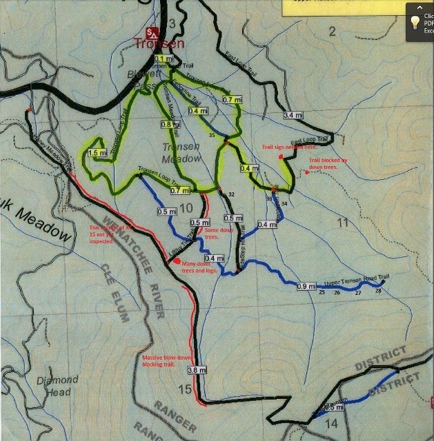 On Saturday I did a survey of the summertime Tronsen Meadows Trail, the Tronsen Ridge Trail, the Haney Meadows Trail and the Lilleby Tie Trail.  I've attached an annotated copy of the trail map you sent me earlier.  I've also put up a captioned photo album on Picasa.