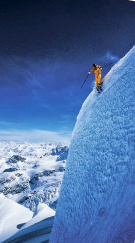 Rotated 'till the horizon is flat. It's still incredibly steep. I'd be surprised if the skier makes anything resembling a turn on that face, but perhaps it's possible?