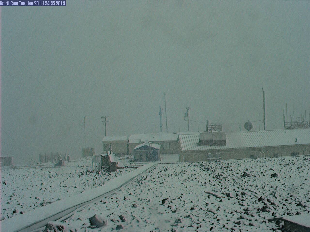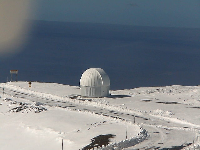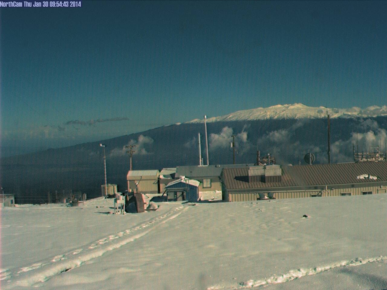 Heavy snowfall started on both mountains around 10am on Tuesday January 28, and quickly accumulated at over 1" per hour by that afternoon, leaving over 1 ft of new snow by Wednesday morning, even down at the 11100 ft Mauna Loa Observatory , an atmospheric monitoring station on the north side of Mauna Loa. So the snowline was well below 11000 ft, yet the Mauna Kea Visitor Information Station at 9200 ft on the south side of Mauna Kea received just some rain and no snow at all, putting the snowline above that elevation -- so call it roughly 10000 ft.