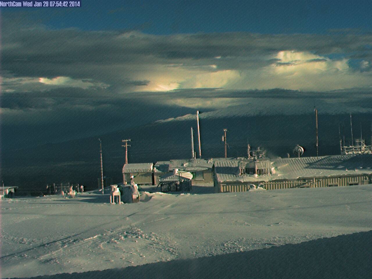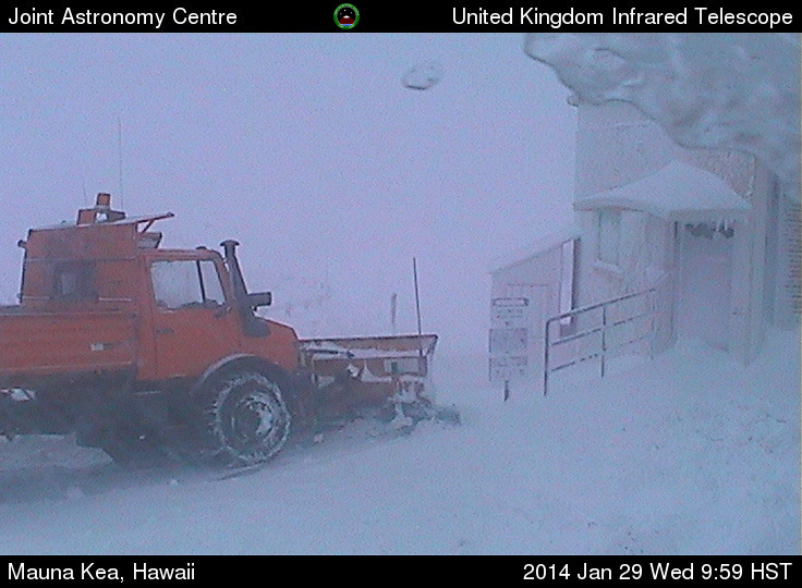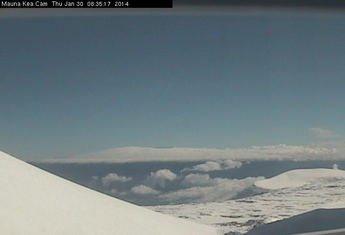 So I was shocked to look at the numerous webcams on Mauna Kea and Mauna Loa (see my Hawaii Mountain WebCams page) and find that snow had fallen down to about 10000 ft elevation, a very low elevation by Hawaiian standards. This unusual event was not predicted (as far as I know) in the forecasts, either from the NWS Honolulu office which typically issues a Winter Storm Warning for the Big Island summits when significant snowfall is expected, nor from the Mauna Kea Weather Center at the University of Hawaii, which issues forecasts for the observatories on the Mauna Kea summit. There is a mention of "a chance for deep convection in the area as well as short-lived periods of heavy snow" in the 8:30am HST Tuesday 28Jan2014 forecast , but that is all.