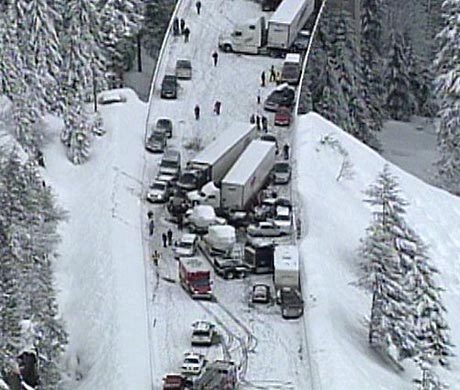 The DOT does a great job. Where it gets screwed up is all the boneheads that don't chain up. Also, I really think that the signage as you approach the pass really sucks. I think at exit 47 they need lot's of signage and a well signed turnaround at the exit - " All BONEHEADS without proper traction Must Exit" and drive back down. As an experienced pass traveler the current signs work fine, but we need to cater to the lowest of life-forms. I mean what bonehead knows where is denny creek? At what point do you put your chains on? Exit 47 Should have a Flashing light bar going over the entire roadway. Chainup area should have signs that say chain-up NOW. If you drive pass 47 without chains it should be totally clear that you are breaking the law. How much is the fine? Let's get old school and put up non-electronic signs that spell out the rules.