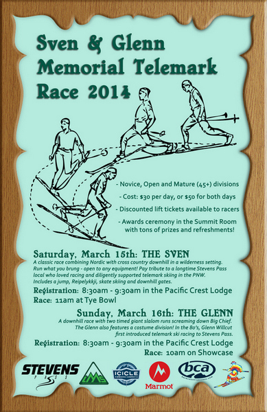 Always a fun weekend with awards party and lots of prizes on Sunday. Saturday's classic race is open to all gear - tele, alpine or snowboard. See if you can beat your buddies on the same gear! (or an old guy like me on alpine, bet ya can't). Glenn was one of the early telemarkin' locals at Stevens back in the days of "tennis shoes and toothpicks". He ran the Scottish Lakes High Camp for the Starks back then. Sven was one of the finest skiers most of us ever saw. He ran the ski school and took over as race chairman from me in the late 80's. Sven was a national caliber tele racer, brought the nationals here and loved the "classic" style of race. HOPE TO SEE YOU THERE!!