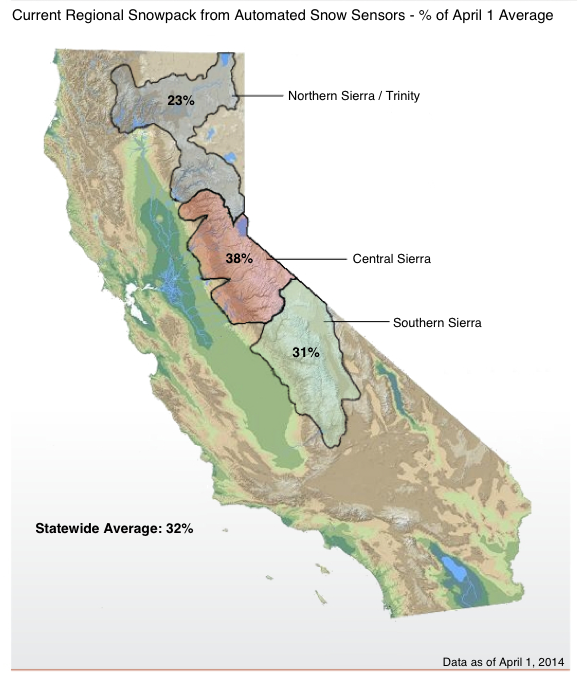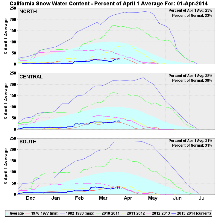 In the northern and southern regions, the snowpack still remains at record low values as of April 1 despite several feet of recent snowfall, comparable or just barely below that of 1976-77, while the central region is now just slightly above those minimums.