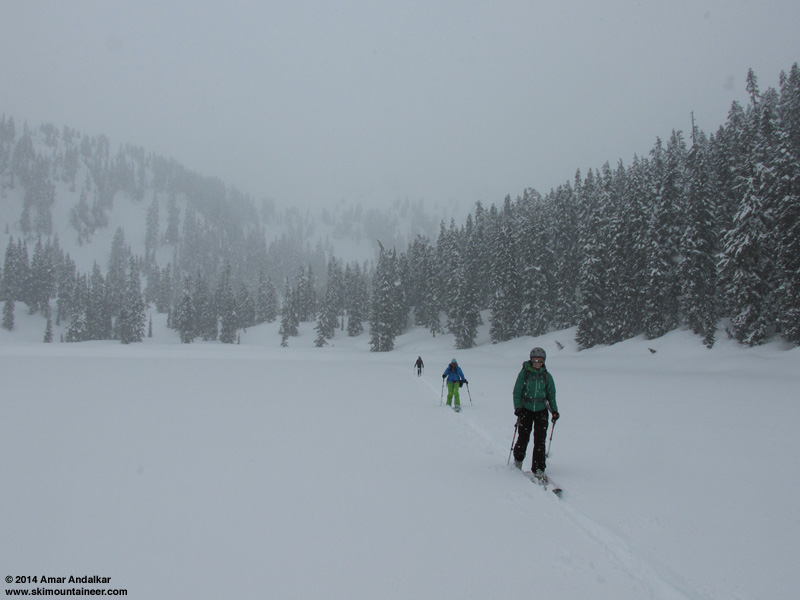 Saturday, March 29: Lichtenberg Mountain from the north via Smith Brook Rd, drizzle below 3700 ft, snowing above that. It was decent heavy powder up high above 4700 ft Licthenwasser Lake, but very unstable, with most slopes over 30° readily wet-sluffing the entire recent snowfall of 8-12", even north aspects. Pretty much as expected given the amount of fresh and recent avy debris visible from the highway in every single steep chute in the vicinity. Luckily, Stevens Pass had gotten the short end of the stick during this storm cycle (after doing far better than most other areas during the past 2 months), with its less-than 1 ft being among the least snowfall of any comparable mountain-crest location from southwestern BC to California (versus 3-5 ft of new snow at the most favored locations). So the sluffs were not deep and dangerous, only thought-provoking, and easily managed by cautious ski cutting and careful route selection. Somewhat scary for my 3 partners, but much less so for me.
