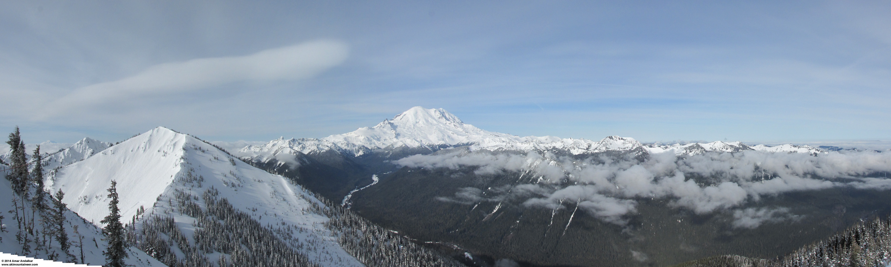 [size=small]The calm between the storms, April 2: Another five-shot panorama of Mount Rainier from atop Crystal Mountain, and again there's much to see besides just the Mountain here. Of particular note are the two large old avalanche crowns still visible in Powder Bowl at left, now softened by 2 ft of recent snowfall during this storm cycle, with a large lee-wave cloud above extending southeast from Rainier due to locally-strong northwesterly flow aloft between storm systems. And also once again there is a barely-noticeable glow on the forested hillside at right, heiligenschein / sylvanshine similar to the panorama in the first post above, but much fainter this time due to high clouds diffusing the direct sunlight and also the solar elevation being a few degrees higher now 9 days later.[/size]