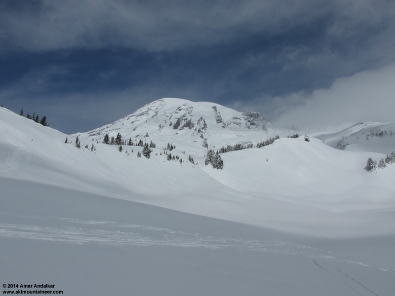 Monday, March 31: Mount Rainier, Paradise, a lovely partly-sunny day, but with an unexpectedly nightmarish combo of horrendous breakable crust and a strong very-cold easterly pass flow, gusting to 30-40 mph at 6000 ft, and perhaps 20-30 mph even across Nisqually Bridge at 3900 ft. Not a pleasant wind at all, was not expecting easterly flow that strong from any forecast, and the Paradise NWAC wind telemetry has been offline for months, so no way to see that it was occurring before leaving home either. The snow was among the worst I've ever skied at Paradise, a 0.5-2" thick wind-solar crust that was almost supportive on skis, but actually not at all, being entirely breakable under body-weight on skis and with 3-4 ft of unconsolidated recent snow beneath it, pole penetration was easily handle-deep in many spots. Not really skiable at all in most areas, only survivable (and barely that). Gave up at 6200 ft due to the howling wind and obviously nasty snow, with a lone skier who had left well before me continuing up Pan Face solo. The strong easterly pass flow was rapidly wind-loading (and cross-loading) many slopes, I even set off a small fresh windslab about 20 ft across and 2-8" deep (fresh wind deposit atop the breakable crust) on my way back dropping into Edith Creek Basin, but skied out of it without incident (it was much too small to cause burial). Should have just skied back via the skin track! Easily in the bottom 5 worst snow conditions I've seen there in well over 200 days skiing at Paradise. Sometimes you win big at Paradise, sometimes you lose: in this case $45 of gas and 8 hours roundtrip from Seattle for 800 vert of pretty bad skiing. Took a bunch of photos and made the best of the day though, but I should have lapped the groomers at Crystal instead like I originally planned to.