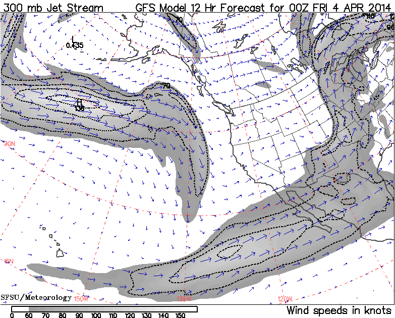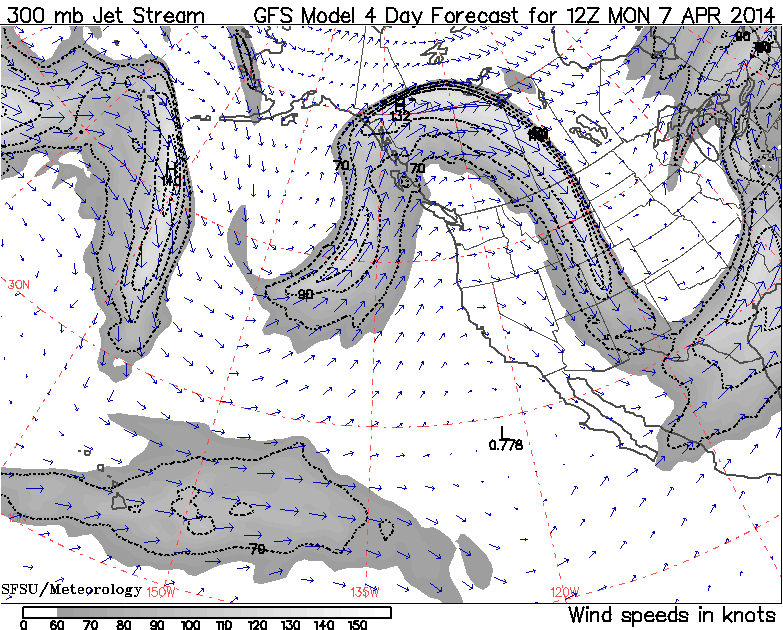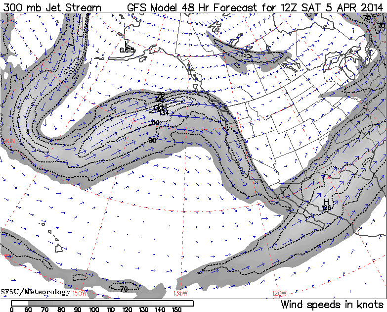 The second phase of this storm cycle has already begun as of early Thursday, with a moderately-strong westerly jet stream developing over the North Pacific, as seen in the jet stream forecasts . Here is the predicted jet stream at 5pm PDT this afternoon: