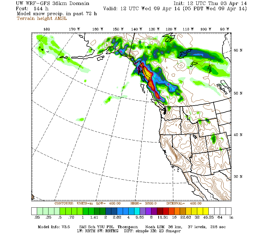 As the predicted ridge builds on Sunday into Monday, this storm cycle does not end but rather the heavy precip and snowfall merely gets pushed farther north. Here is a broad overview from the 36km resolution showing snowfall over the 3-day period through 5am next Wednesday, with very little over Washington (at this low resolution) and 3-4 ft predicted over parts of southeast Alaska:
