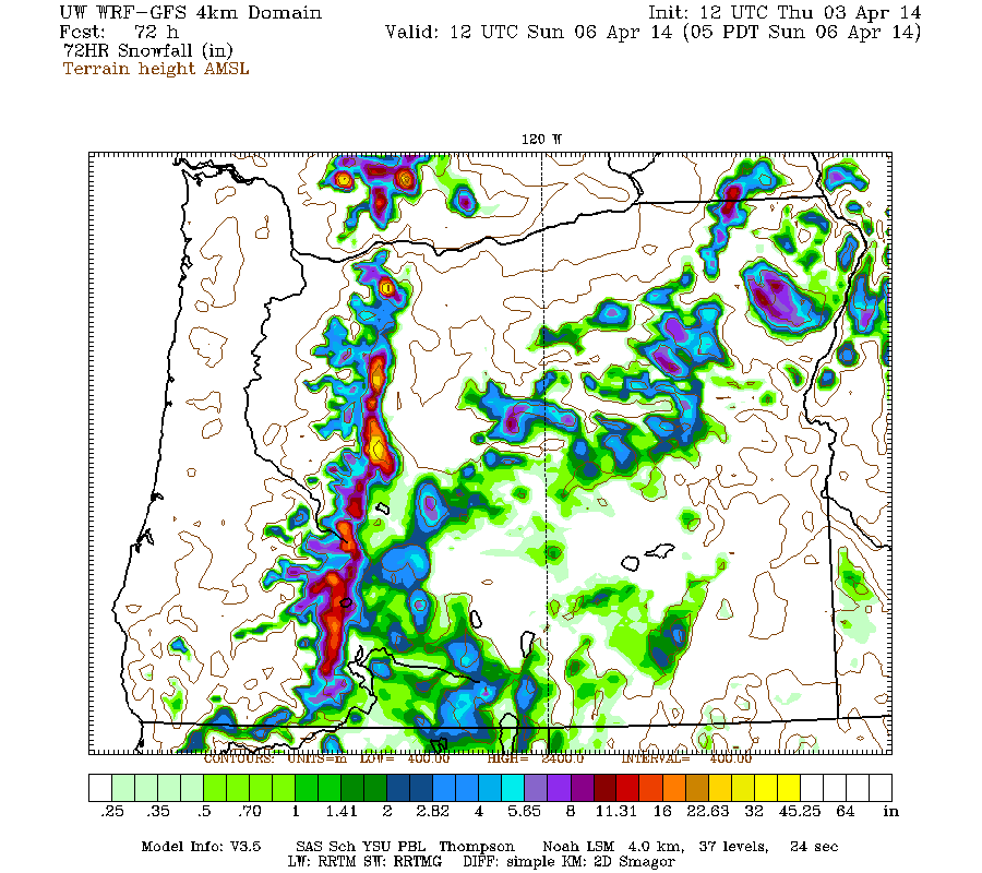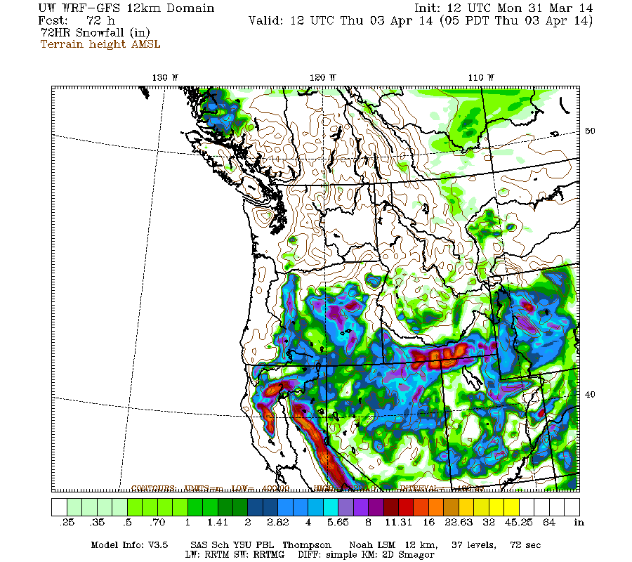 The high-resolution UW WRF-GFS model predicts snowfall during the next 3 days from Monday morning through 5am Thursday of about 1-3 ft for the California Cascades, Klamath Mountains, and Sierra Nevada, with about 4-10" extending north through the Oregon Cascades and barely a couple inches reaching the southern Washington Cascades: