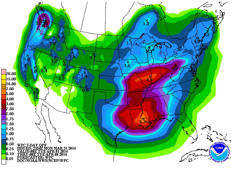 The NWS's GFS model and their Quantitative Precipitation Forecasts are showing up to 2-4" of additional precip over the next week for the mountains of southwestern BC and Washington, with 1-2" extending south into Oregon and California. Here is total precipitation in inches predicted over the next 7 days through the afternoon of Monday, April 7, showing much more modest amounts than any of the previous similar graphics in earlier posts above: