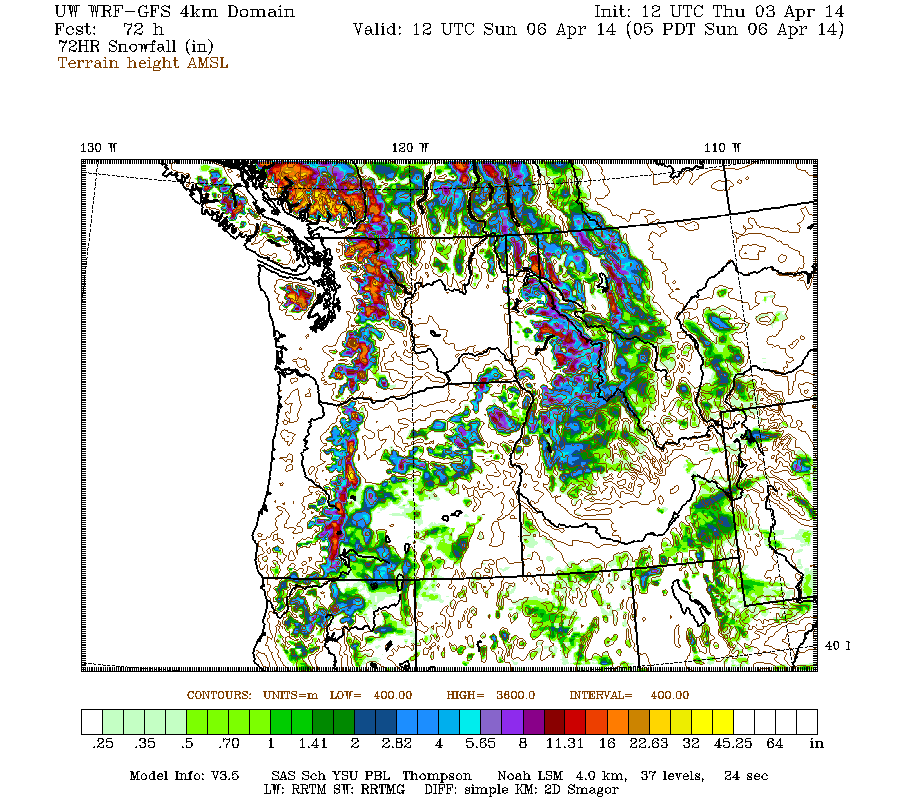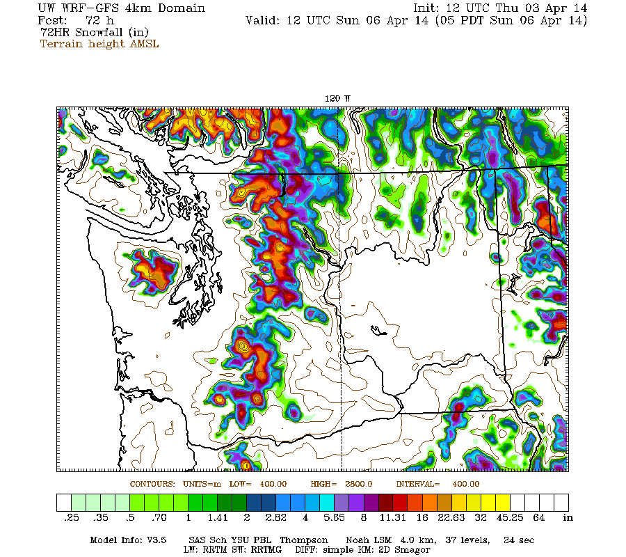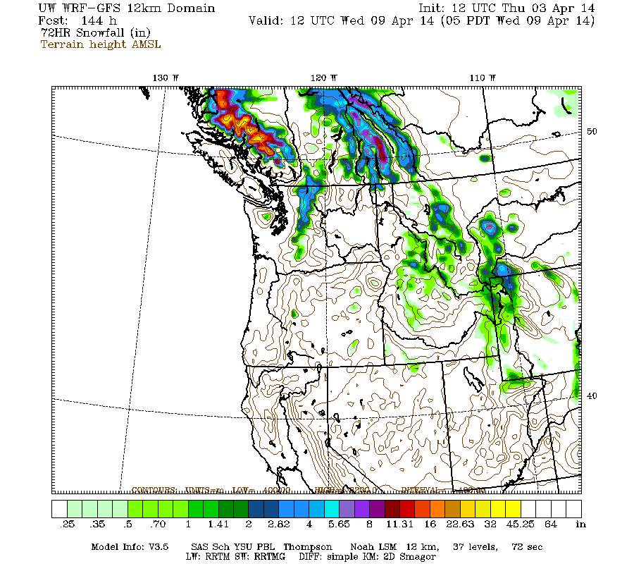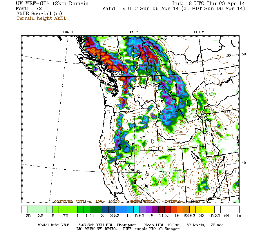 The high-resolution UW WRF-GFS model predicts snowfall during the next 3 days through 5am Sunday of about 1-3 ft for southwestern BC, the Olympics, Washington Cascades, and Oregon Cascades, with less than 1 ft extending south into the California Cascades and Klamath Mountains: