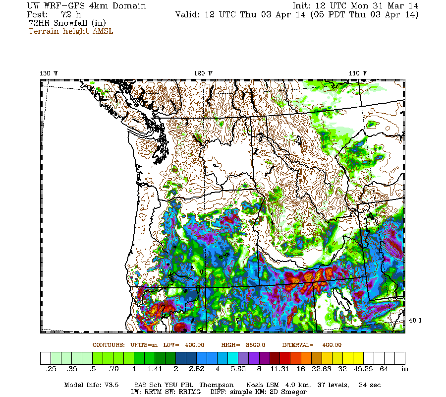After the current system moves through California by early Wednesday, the next system is expected to begin moving ashore by early Thursday, on strong westerly flow and aimed into the Pacific Northwest this time. Initially the precip and snowfall will reach southwestern BC, then spread south through Washington and Oregon by early Friday and continue throughout Saturday, with some snowfall lingering into Sunday (April 6) at the northern end of the region. Additional snowfall during the subsequent 3 days ending 5am next Sunday is predicted to be 1-3 ft in southwestern BC and the Washington Cascades, with up to 1 ft in the Olympics and Oregon Cascades, and barely a few inches extending south to northernmost California:
