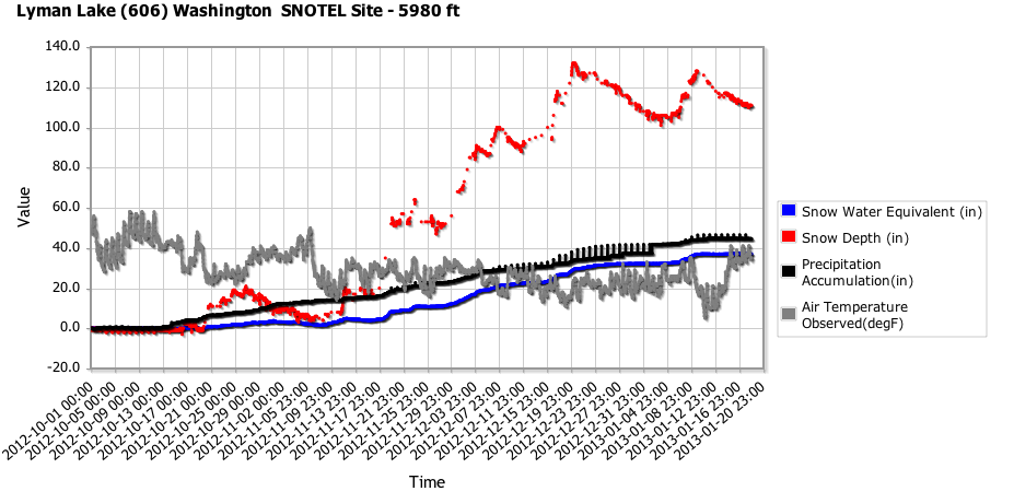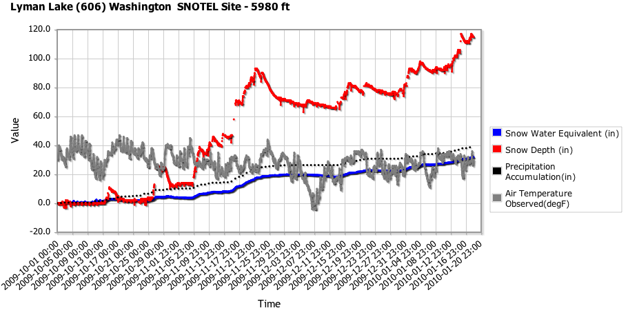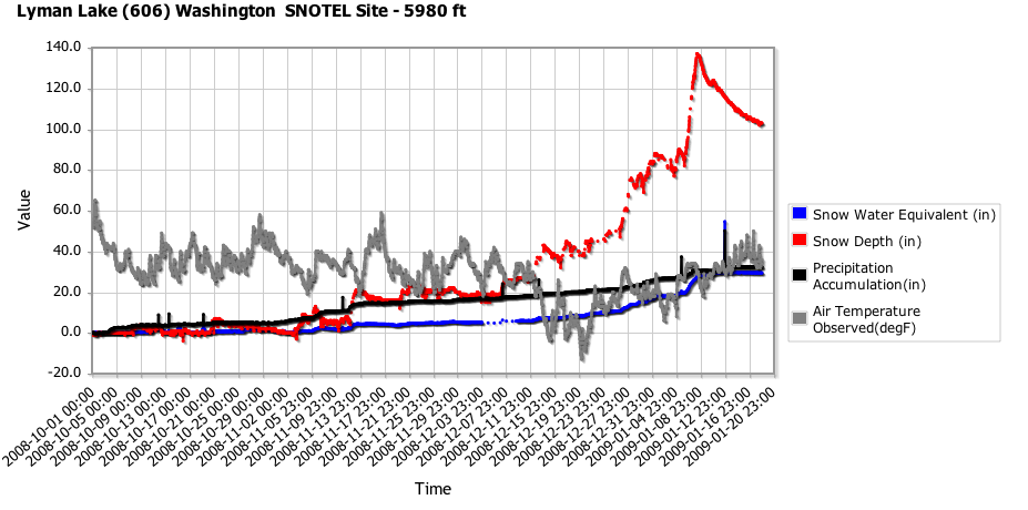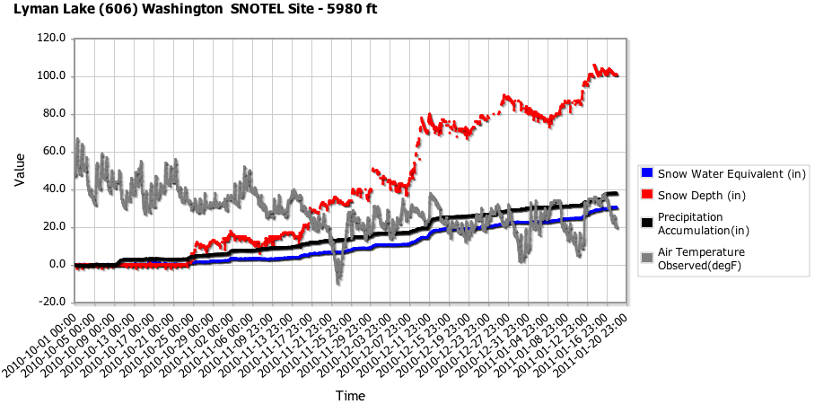 Back to Lyman Lake: Here is a plot of snowdepth, snow water, precip, and temperature since the start of the water year on October 1, made using the NRCS Report Generator , which shows it hitting 99" on January 5 and finally breaking 100" today: