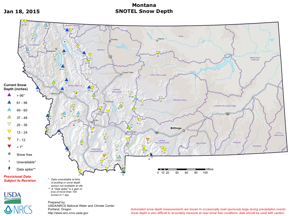 And also zoomed in on Washington and Montana to easily see the highest snowdepth sites, with values listed as of midnight January 18: