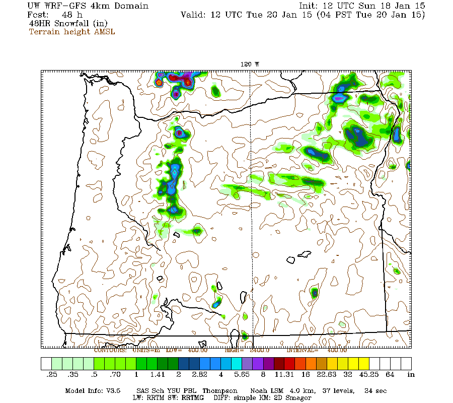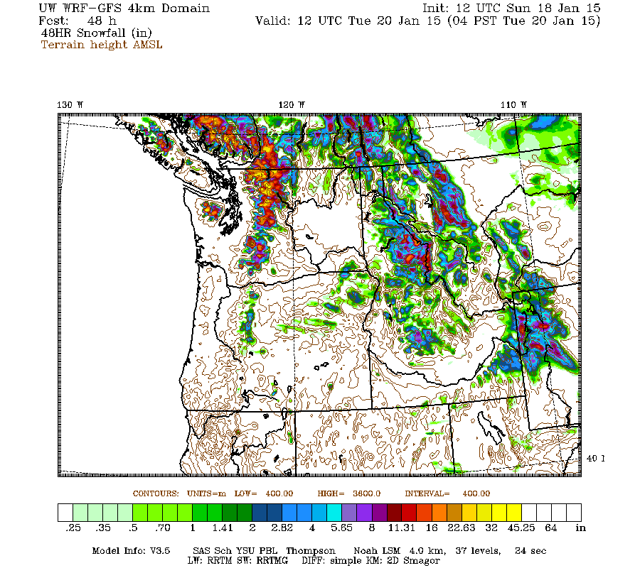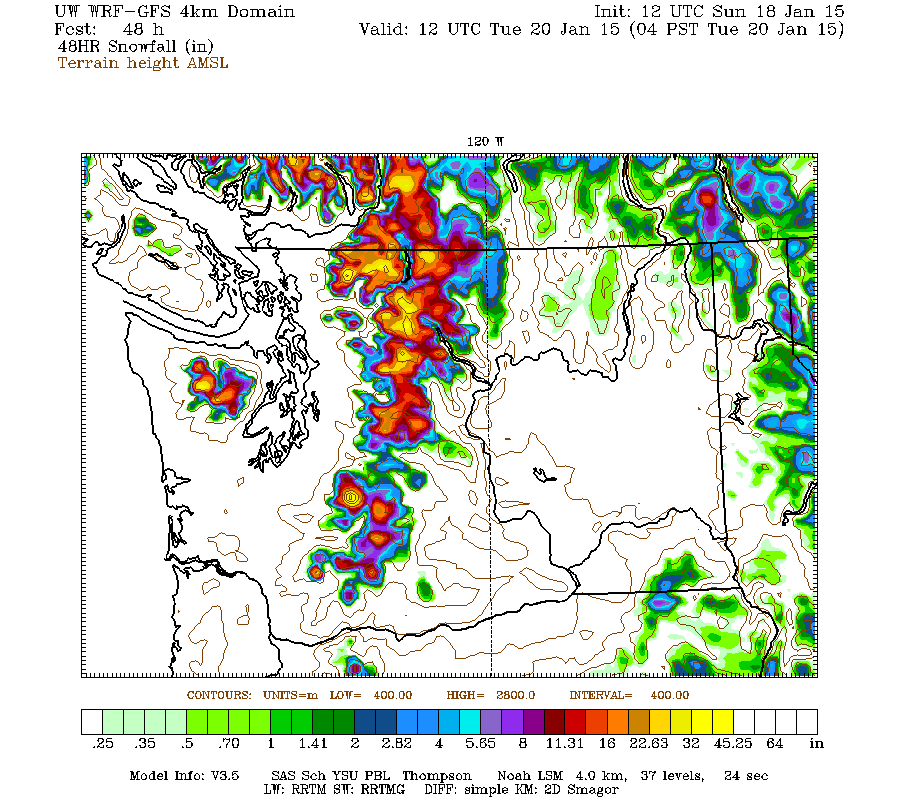 Regarding snowpack, very little has changed throughout the western US in the 2 weeks since this thread was started, although now that the cold front is passing and heavy rain is changing to snowfall, the snowpack should get a decent boost especially in Washington by late Monday. The high-resolution UW WRF-GFS model is predicting new snowfall amounts of up to 1-3 ft over the next 48 hours through 4am Tuesday for the Washington Cascades, with lesser amounts of up to 4-8" extending into the northern Oregon Cascades: