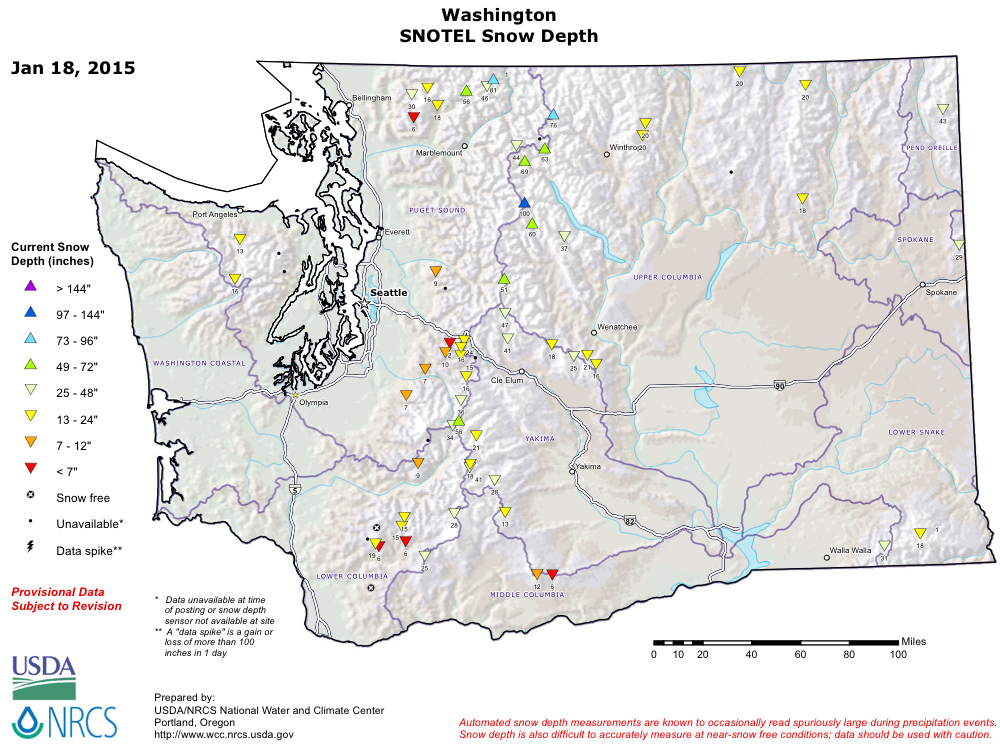But as usual so far this season, high-elevation sites in the North Cascades especially east of the Cascade Crest were insulated from most of the warming aloft by the deep pool of colder air which typically fills Eastern Washington during winter, and instead of pouring rain, the precip remained mostly snow. The Lyman Lake SNOTEL site located just a half-mile east of the crest near Holden received about 20" of new snowfall, bringing its snowdepth up to 106" as of midday Sunday (Monday morning update 19Jan2015: now 112", with about 30" of total new snow in the past 48 hours, including the effects of settlement):