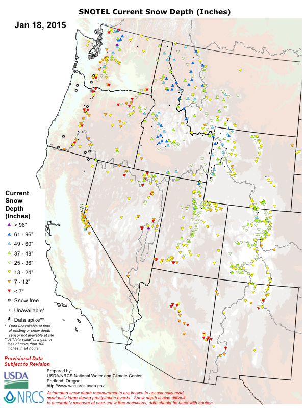 Here is an overview of current snowdepth from the SNOTEL network throughout the western US (except Alaska which is having a very poor snow year too, and most of California which has a separate state-run network):
