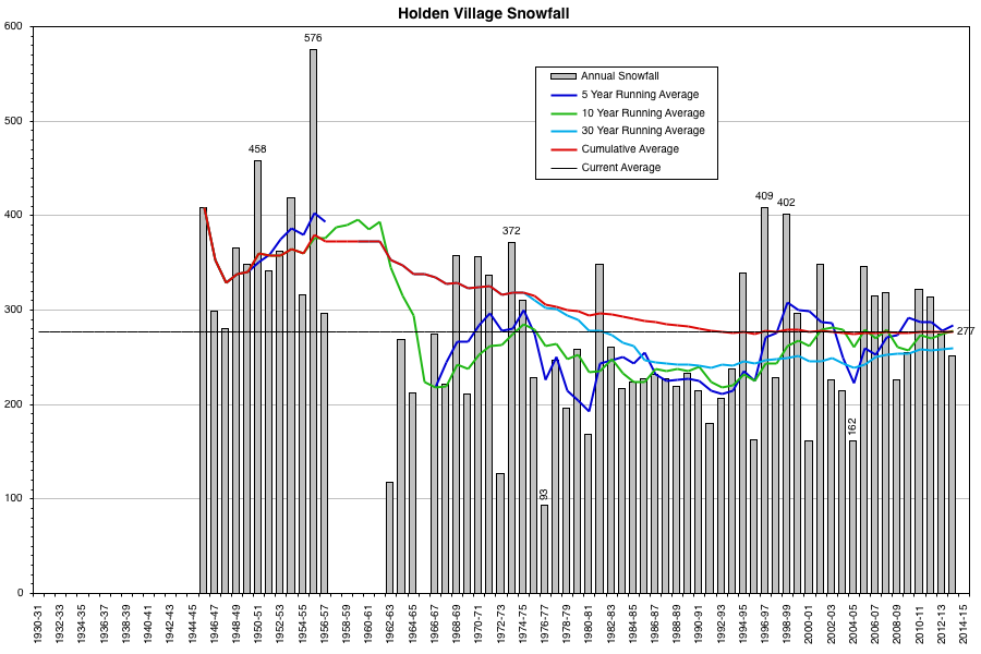 Even at low elevations of 1500-3500 ft as we are considering, and even looking for data that only extends back at least 50 years, there are less than a handful of sites in the Washington Cascades with reasonably complete snowfall and snowdepth data over that period: Longmire (2760 ft), Snoqualmie Pass (3000 ft), and Holden Village (3220 ft). Longmire and Snoqualmie have data back to 1909 and 1910, but the snowfall data is very incomplete with many missing months prior to 1930 at Snoqualmie. At Holden Village, the data prior to 1962 comes from a site listed as "Holden" with the same coordinates but elevation 200 ft higher, so the snowfall may not have been recorded at the same exact location. Here are plots of the snowfall data at these three sites with several running averages superimposed (data from WRCC , NCDC , and WSDOT Snoqualmie Historical Snowfall Records ):