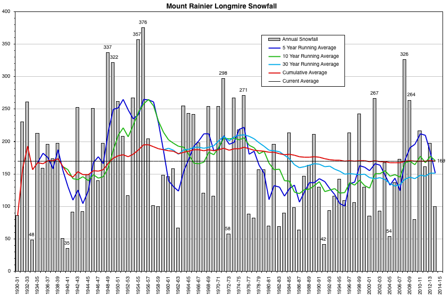 Useful snowfall or snowpack data in the Cascades extends back for about one century, with data from Mount Rainier back to 1909 at Longmire (2760 ft) and to 1916 at Paradise (5430 ft). Paradise is absolutely the keystone site in any analysis of Cascade snowfall and snowpack, being one of the only 2 mid-high elevation sites in the entire Cascade Range with snowfall and snowdepth data extending back for over 90 years (Crater Lake Park HQ at 6470 ft in southern Oregon is the other) while also holding the honor of having the greatest average annual snowfall of any measurement site in the world (over 650") and the maximum snowfall ever recorded in a one-year period (over 1200" from February 1971 to 1972). For almost any question that I think of regarding snowfall and snowpack trends, the first site that I look at the data for is Paradise, followed by Crater Lake. It's really unfortunate how few such sites have good snowfall and snowdepth data over such a vast mountain range as the Cascades, as crucially important sites which really should have such data like Mount Baker Ski Area and Mount Hood Timberline, sadly do not have it or only have it for short periods.