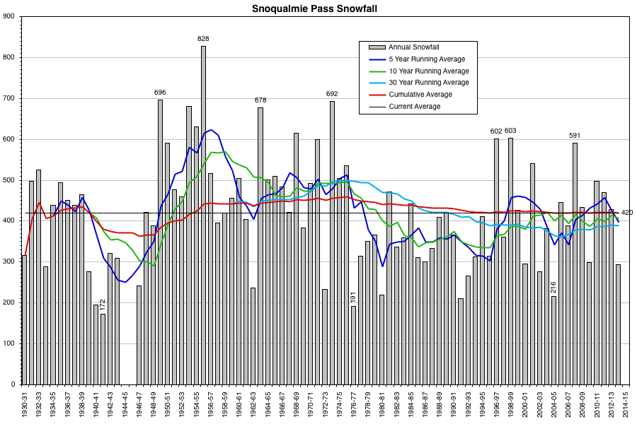 The data gathered and analyzed is very impressive Amar, thanks for delving into this. My observation is that some years in the latter 70's, 80's, early 90's were not as deep and long lasting but did afford skiing at our local areas. Sometimes pretty thin coverage, but adequate.....mostly. The 2005 event and this years stand out although 05 turned a corner late. One has to wonder when the warmest couple years of record show up (don't say this to a mid-westerner, they're getting the polar hammer) along with significant ice melt if the next, say 20 years a predictive approach could let us look into the crystal ball? I can imagine mean snow levels going upward, enough moisture in the storms to drop meaningful amounts of snow, but temp's will be just a few degrees off. Probably some forecasts thinking we'll dry a bit but I doubt there's hard evidence. The conjecture that Snoqualmie Pass will be lucky to pull off a ski season in 20 to 30 years is sounding more real though. In your research do you look at data modeling of longer-term projections? Maybe you've seen some of the "what-if" scenario's and what us armchair weatherpersons might notice should the weather influences go contrary? Just curious and again, very nice job!