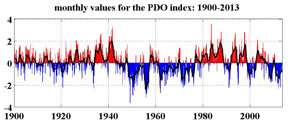 As for the PDO, I know of no similar study, but the correlations appear to be fairly obvious in this case, especially for the Cascades and southern BC: the cool phase of the PDO corresponds to 1-3 decade-long periods of generally well above-normal snowfall and snowpack (although some individual years may still end up well below-normal), while the warm phase brings 1-3 decade-long periods of generally below-normal snowfall and snowpack (although some individual years may still end up above-normal). Here is a plot of the monthly PDO index from 1900-2013 from the UW JISAO :