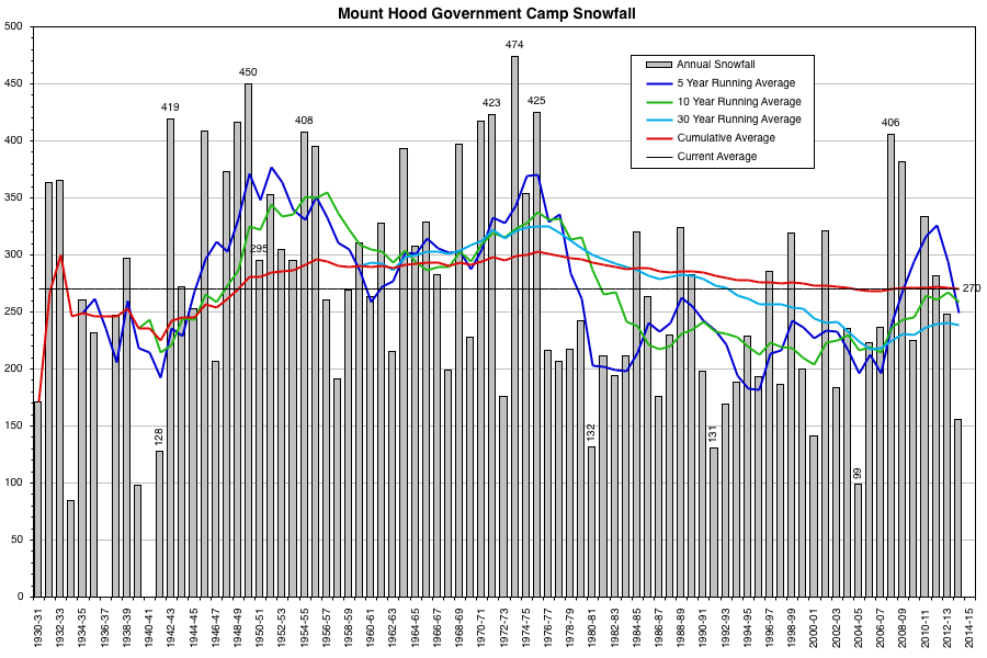 Government Camp (3980 ft) is located on the southern flanks of Mount Hood, about 6 miles SSW of the summit and 3 miles west of the Cascade Crest (which goes up the south side of Hood just west of the White River drainage). It has an average annual precip of 88" to produce its 270" average annual snowfall, which is less than half the average annual snowfall of over 550" with 110" of precip recorded at Timberline Lodge (5900 ft), about halfway from Govy to the summit. Government Camp has one of the longest historical climate records of any mountain location in the entire Cascade Range, with weather records including snowfall and snowdepth extending back to 1895. The current Government Camp site has data back to 1951, while prior to that from 1895-1951 the records are listed under "Summit Guard Station" with the same coordinates and an elevation of 3900 ft, so the snowfall may not have been recorded at the same exact location. Note that prior to 1941, the annual snowfall totals shown above only include data from November through March, so the annual snowfall is being under-reported by roughly 10-15% on average due to missing April (which averages about 26" for the month) and October and May (which each average about 6"). I considered leaving those years out of the plot, but decided to include them with that disclaimer.
