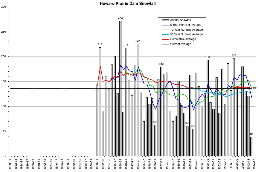 Howard Prairie Dam (4570 ft) is located about 15 miles SSW of Mount McLoughlin and 15 miles north of the California border, about 9 miles west of the Cascade Crest. Despite being west of the Crest, due to rain-shadowing from the 7000+ ft peaks of the Siskiyou Mountains to the west and southwest, this is a much drier climate than areas farther north like Lemolo Lake, with an average annual precip of 32" to produce its almost 140" average annual snowfall. Although a strong downward long-term trend is not clear, there are definitely more medium-term ups and downs than either of the previous 2 sites, and once again the past 3 seasons have all been below normal due to the effects of the California drought, with 2013-14 sadly posting the all-time record low snowfall at this site over its 50+ year period of record.
